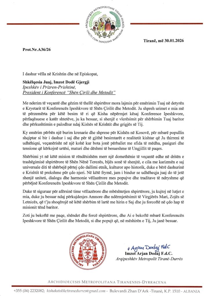 Nëpërmjet një letre të publikuar në faqen zyrtare të Argjipeshkvisë Metropolitane Tiranë-Durrës, Sh. T. Imzot Arjan Dodaj, argjipeshkvi metropolit i kësaj argjipeshkvie ka uruar ipeshkvin tonë për emërimin në krye të Konfrencës Ipeshkvnore Ndërkombëtare “Shën Çirili dhe Metodi”, duke shprehur afërsi vëllazërore dhe duke mirënjohur këtë detyrë si besim dhe vlerësim i Kishës për shërbesën e tij ipeshkvore.